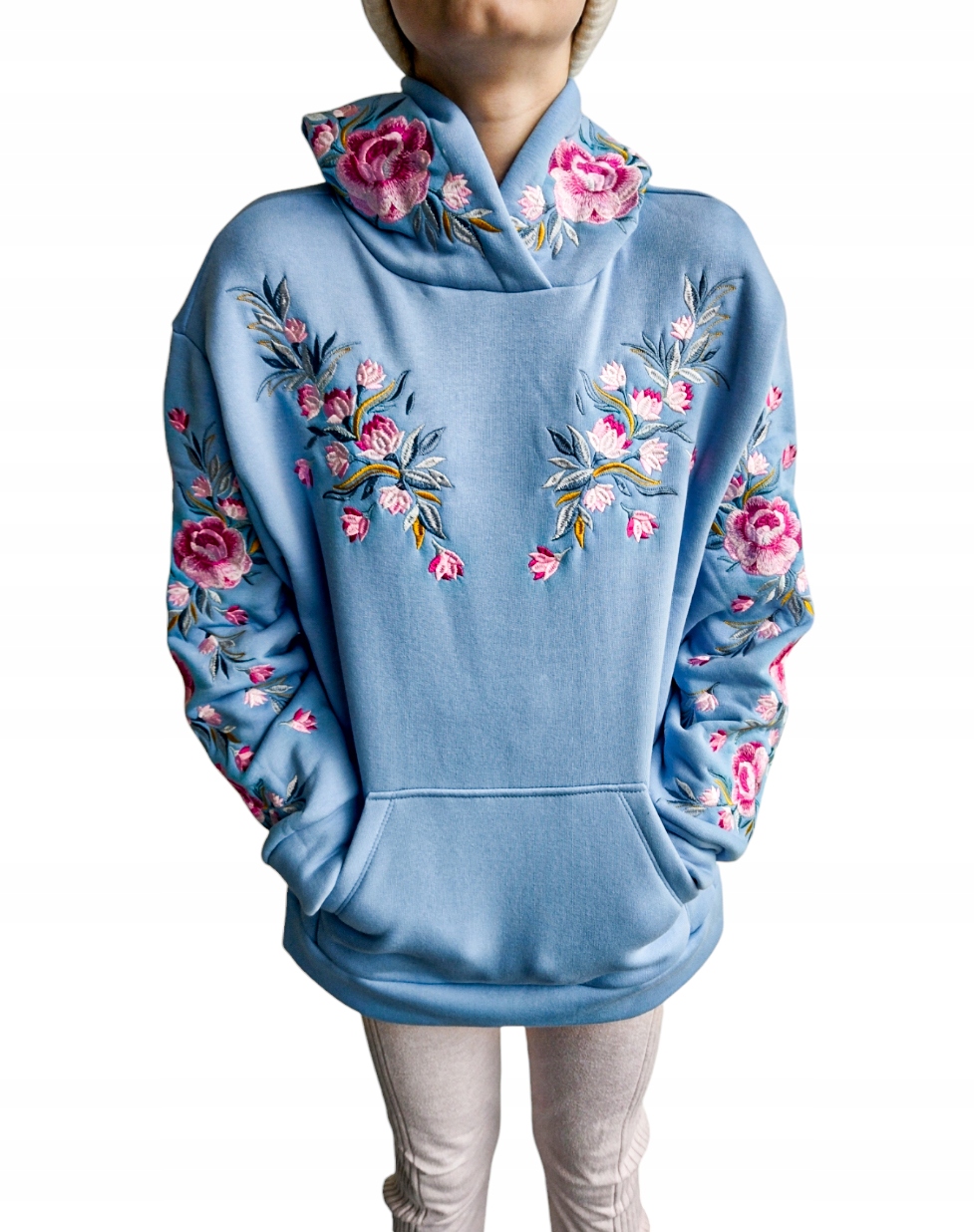 BLUZA Z HAFTEM KWIATY L CIEPŁA MIŁA KAPTUR KIESZEŃ NIEBIESKA 190.00zł