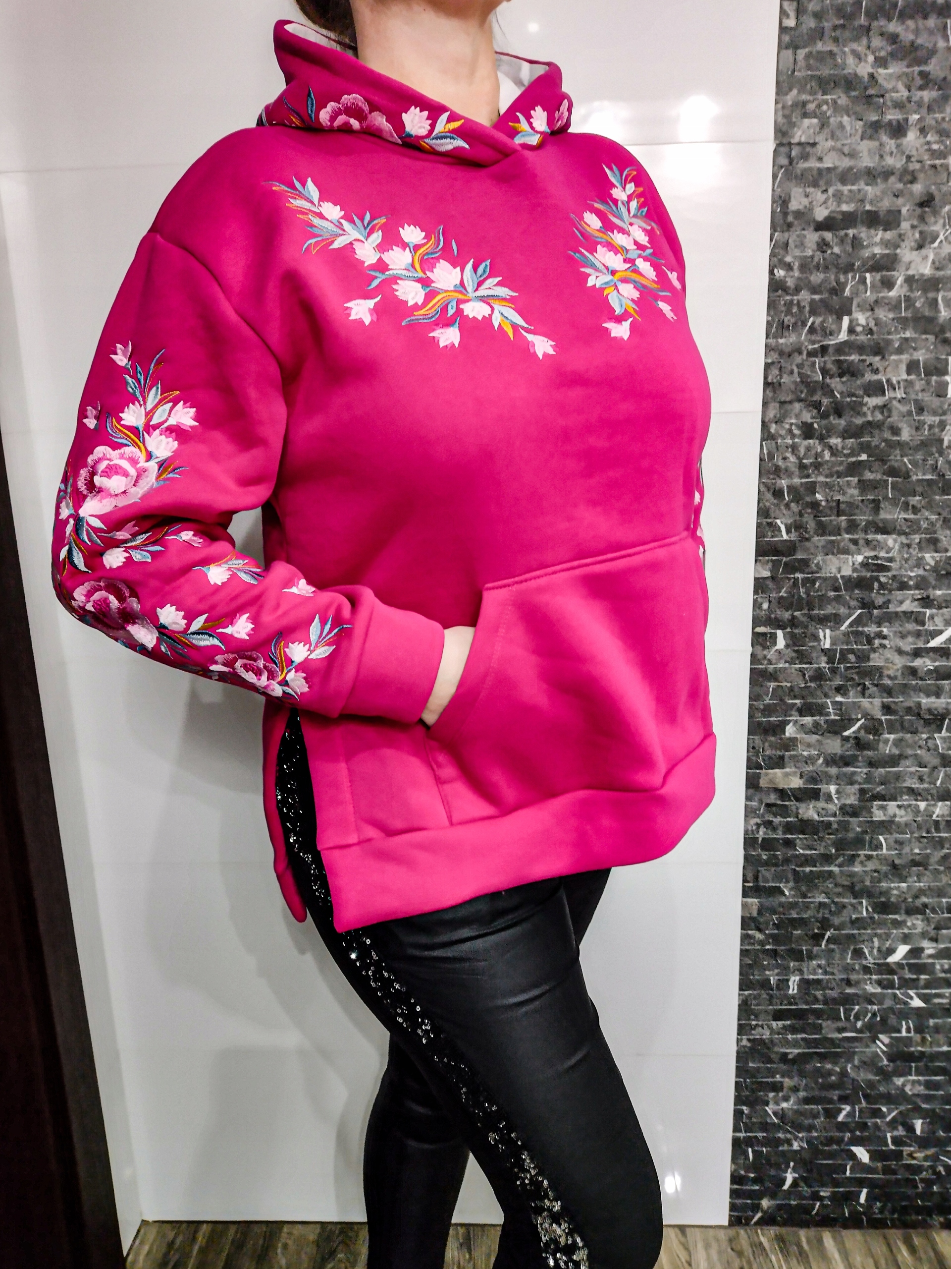 BLUZA Z HAFTEM KWIATY S CIEPŁA MIŁA KAPTUR KIESZEŃ RÓŻOWA 190.00zł