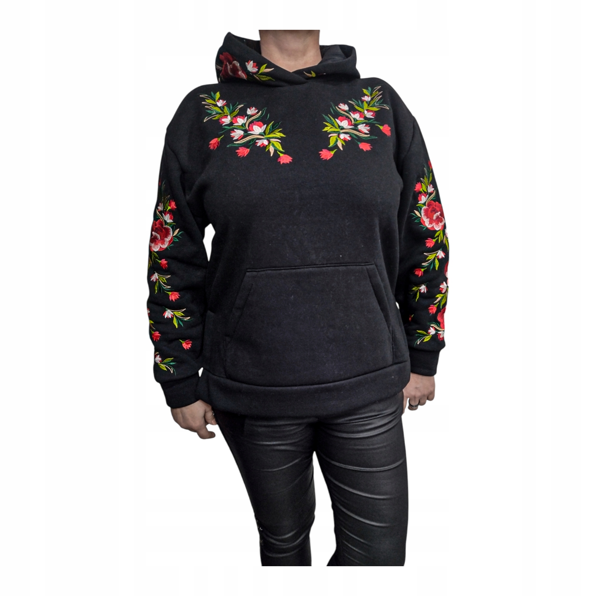 BLUZA Z HAFTEM KWIATY XL CIEPŁA MIŁA KAPTUR KIESZEŃ czarna 190.00zł
