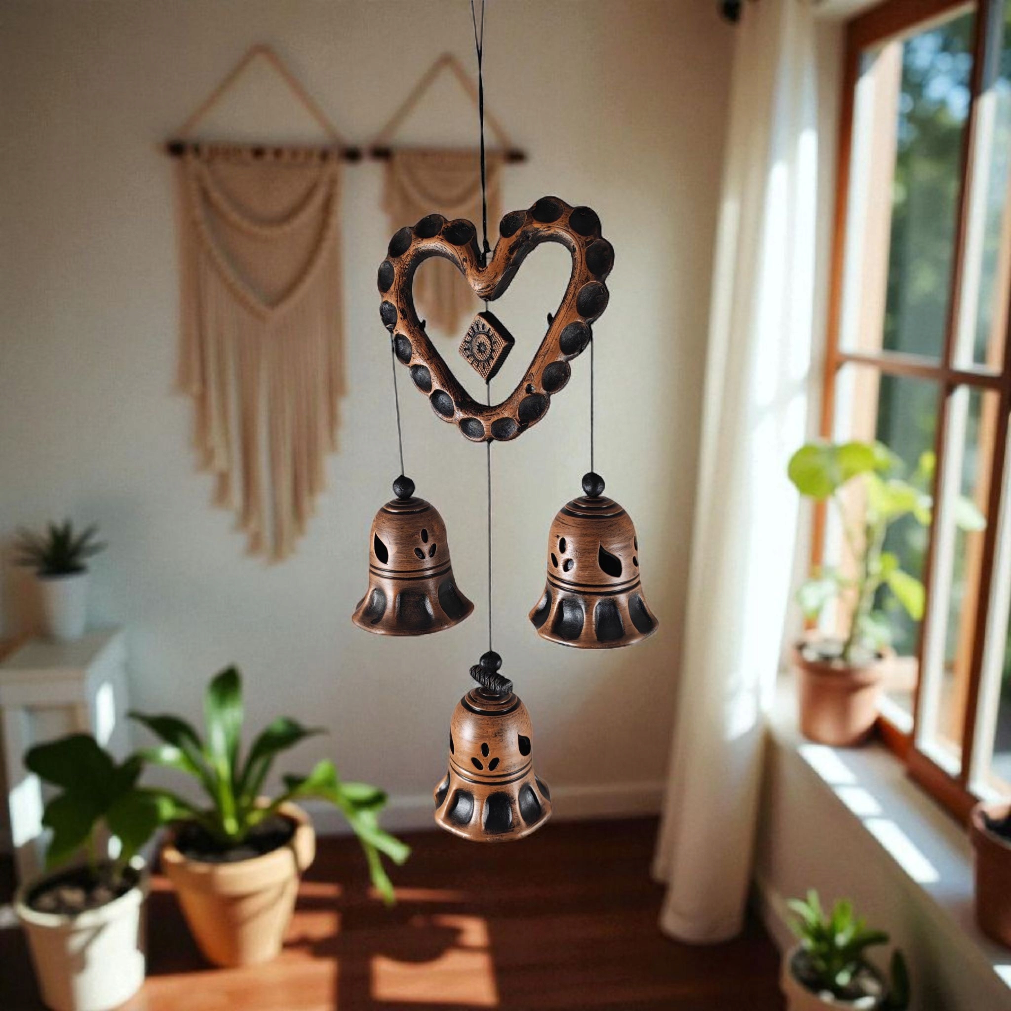 DZWONEK CERAMICZNY BRĄZOWY RĘCZNIE ZDOBIONY 3 dzwonki+serce 45cm 65.00zł