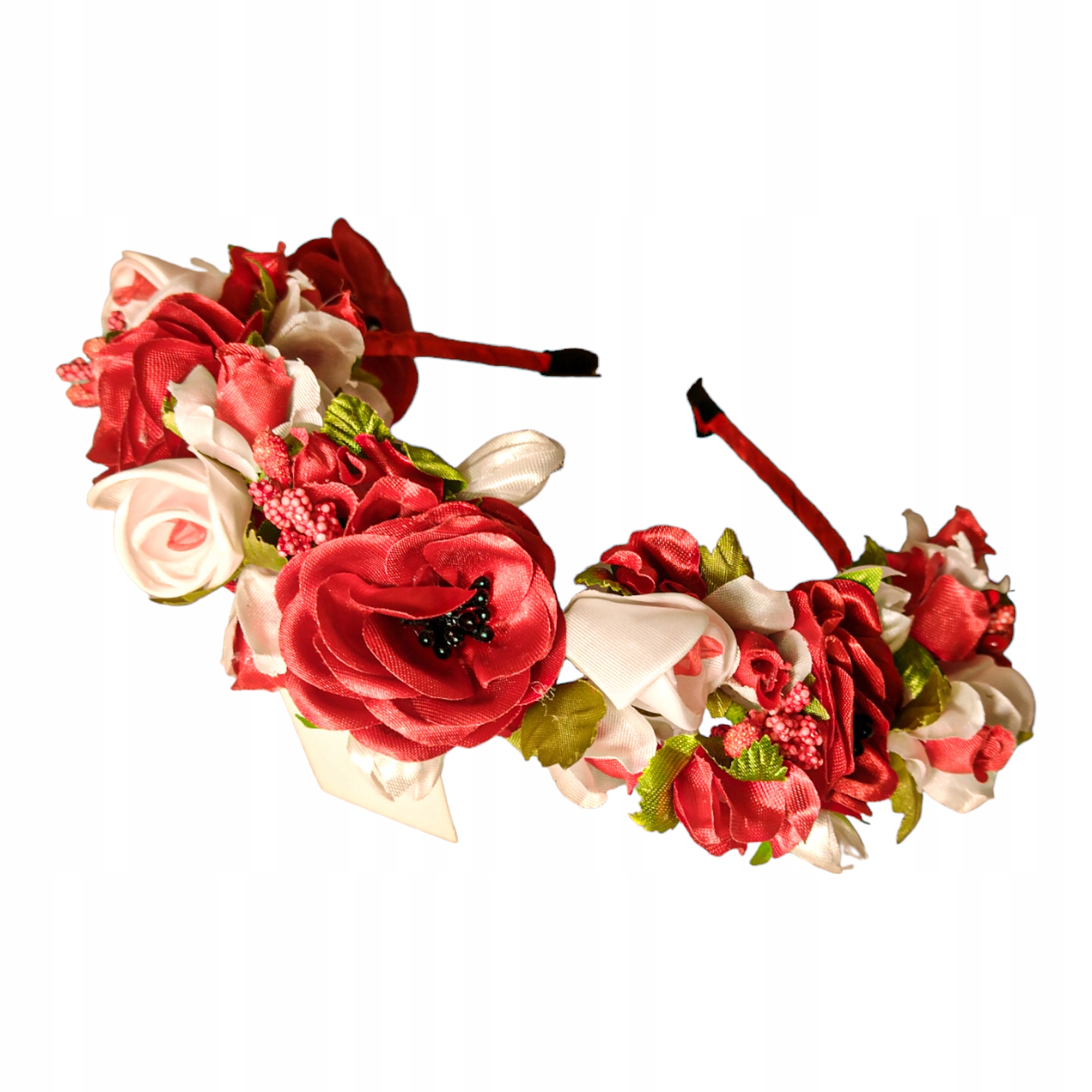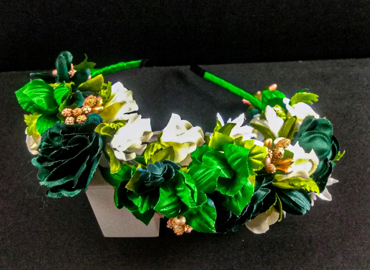 Kwiaty na metalowej opasce obciągniętej atłasową tkaniną